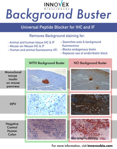 Innovex Background Buster is a diverse and powerful Peptide-based Technology for eliminating general background staining in tissues and cell preparations stained with antibodies in IHC & ICC and with DNA or RNA probes for in-situ procedures.